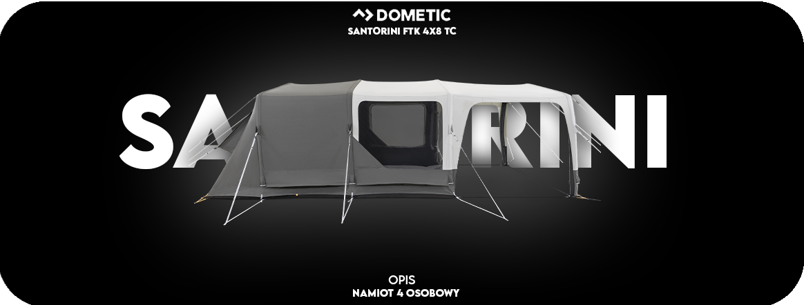 - Dometic Santorini FTK 4X8 TC to nadmuchiwana konstrukcja namiotu dla 4 osób, zapewniająca ochronę przed wiatrem i deszczem, jest łatwy montaż oraz posiada dobrą wentylację.