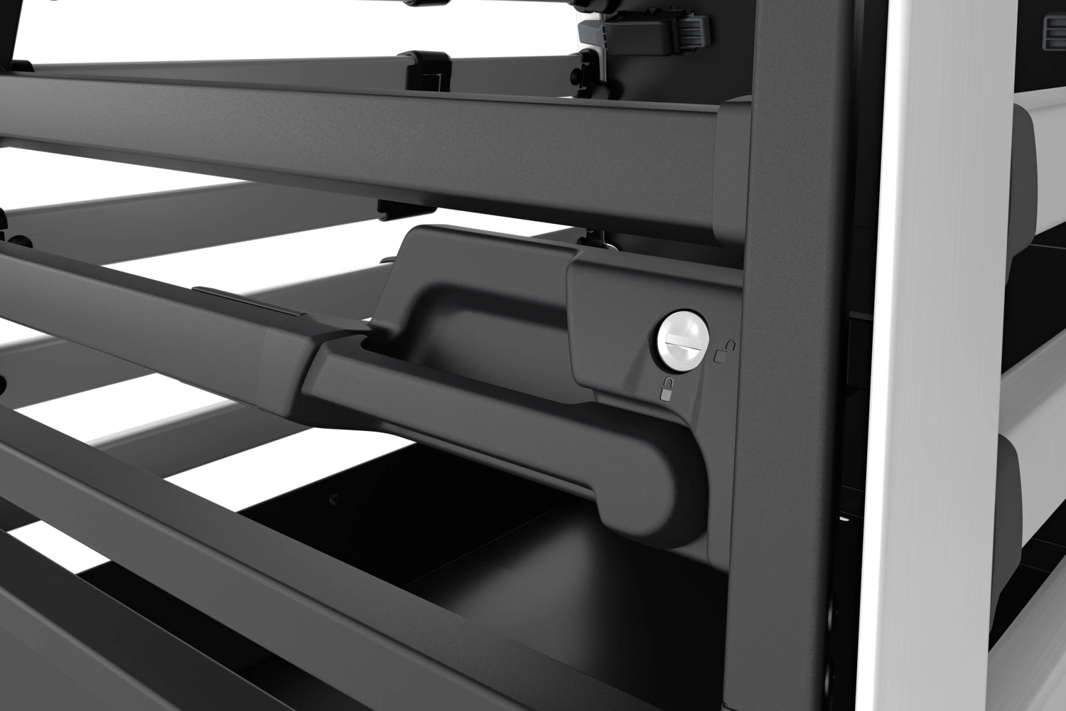 • Bezpieczny zamek z kluczem i awaryjne otwieranie: Drzwi klatki można zablokować na czas jazdy za pomocą solidnego zamka z kluczem, co zapobiega przypadkowemu otwarciu. W sytuacjach awaryjnych klatkę można jednak otworzyć także od tyłu, zapewniając szybki dostęp do wnętrza.