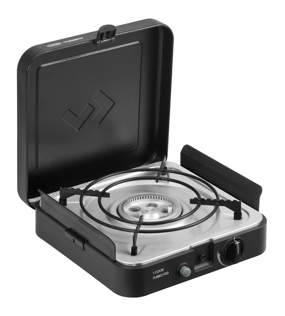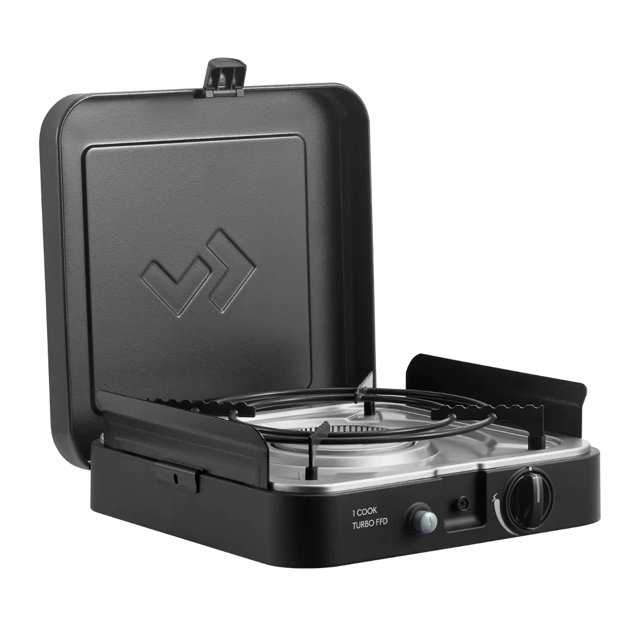 1 Cook Turbo FFD Stove to lekka, przenośna kuchenka gazowa z palnikiem Turbo, przeznaczona do użytku wewnątrz i na zewnątrz. Wyposażona w urządzenie Flame Failure Device (FFD), automatycznie odcina dopływ gazu w przypadku zgaśnięcia płomienia, co zwiększa bezpieczeństwo użytkowania w namiocie, przyczepie czy na świeżym powietrzu.