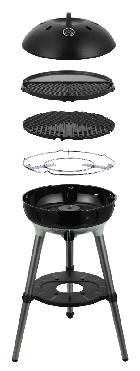 Carri Chef 40 to przenośny grill gazowy o średnicy rusztu 40 cm, idealny do domu, ogrodu i na kemping. Aluminiowa misa z rączkami pozwala przygotować potrawy typu paella, a pokrywa może pełnić funkcję piekarnika lub osłony przeciwwiatrowej.