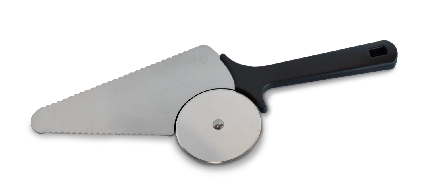 - Pizza Slicer 2‑w‑1 to wielofunkcyjne narzędzie do krojenia i serwowania pizzy. Wyposażone w ząbkowaną krawędź, łatwo radzi sobie z grubymi brzegami ciasta. Można myć w zmywarce, co zapewnia wygodę użytkowania i szybkie podanie świeżo pokrojonej pizzy.