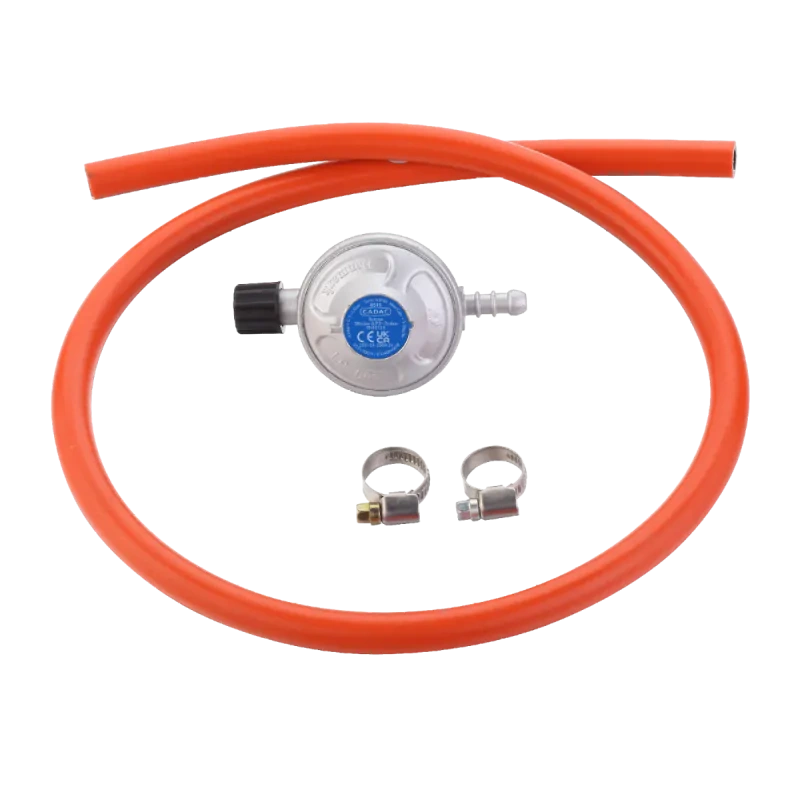 - Regulator ciśnienia gazu 30 mBar do butli Campingaz z uniwersalnym łącznikiem, wężem 100 cm i dwoma zaciskami.