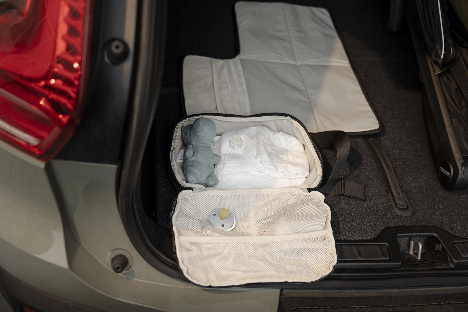 Zawiera zdejmowaną saszetkę na ramię na pieluchy i chusteczki oraz wyściełaną, łatwą do czyszczenia matę do przewijania z kieszeniami i workiem na drobne, brudne ubrania.