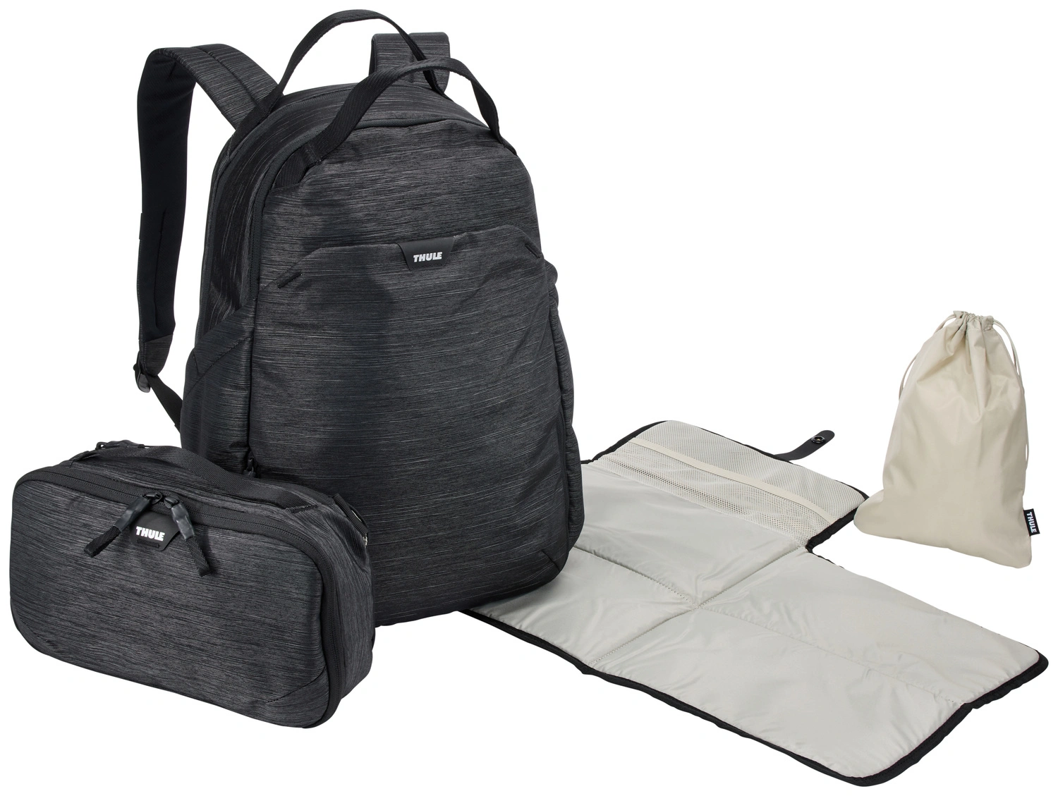 - Thule Changing Backpack ułatwia organizację akcesoriów dziecka, zapewnia szybki dostęp do najpotrzebniejszych rzeczy i sprawdza się zarówno podczas krótkich wyjść, jak i całodziennych aktywności.