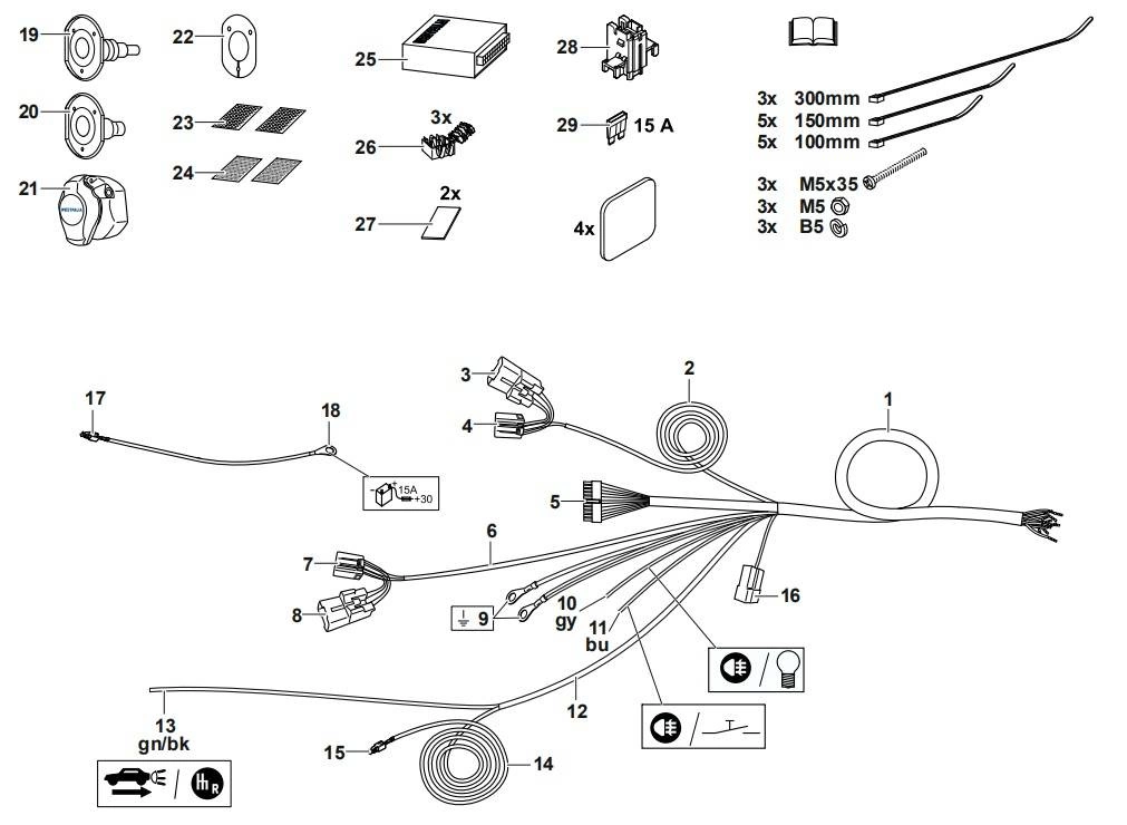 Wiązka posiada 13-pinowe gniazdo odpowiednie dla bagażnika rowerowego i przyczep ze światłem wstecznym.