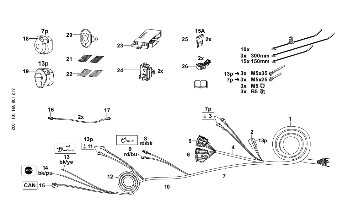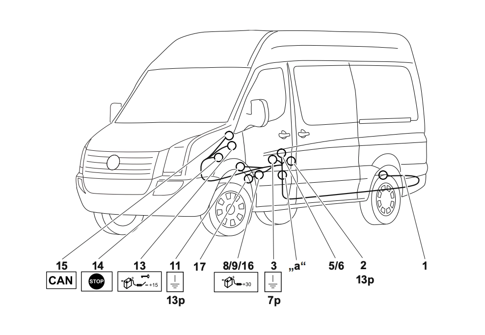 Wiązka wyposażona jest w 7-pinowe gniazdo przeznaczone do obsługi lekkich przyczepek (do 750kg DMC). Bagażniki rowerowe i ciężkie przyczepy można podłączyć po zastosowaniu adaptera (brak obsługi światła cofania).