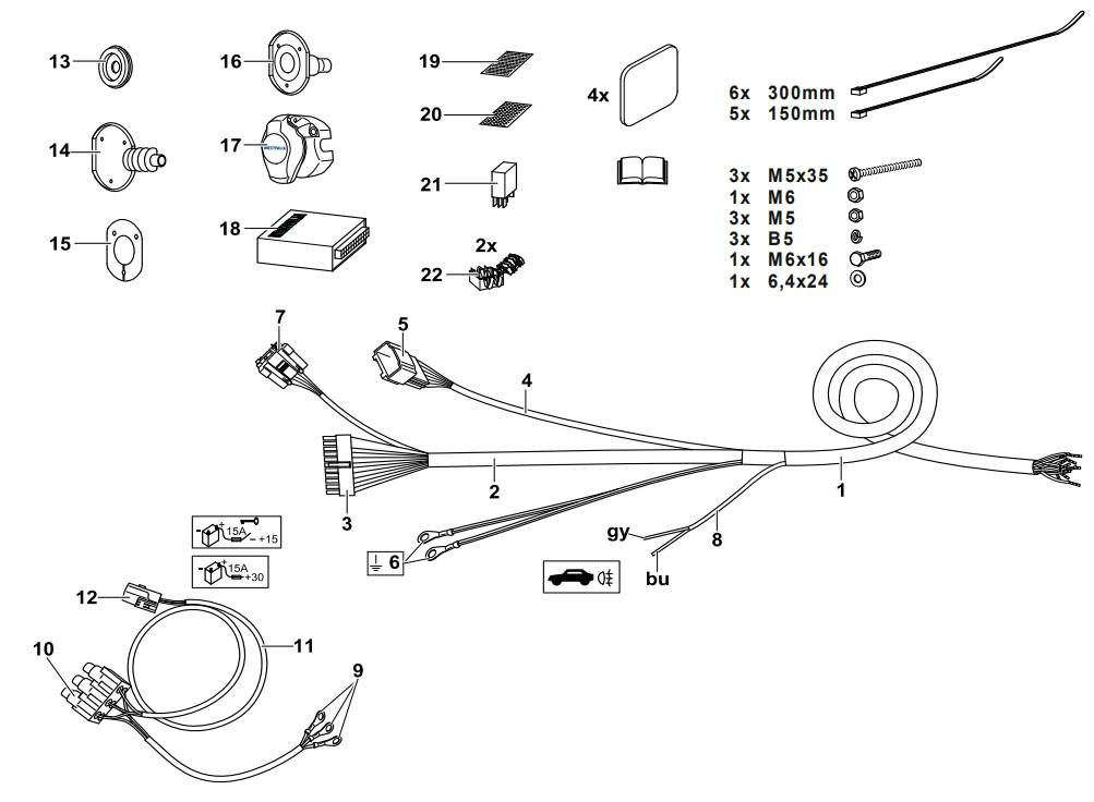 Wiązka posiada 13-pinowe gniazdo odpowiednie dla bagażnika rowerowego i przyczep ze światłem wstecznym.
