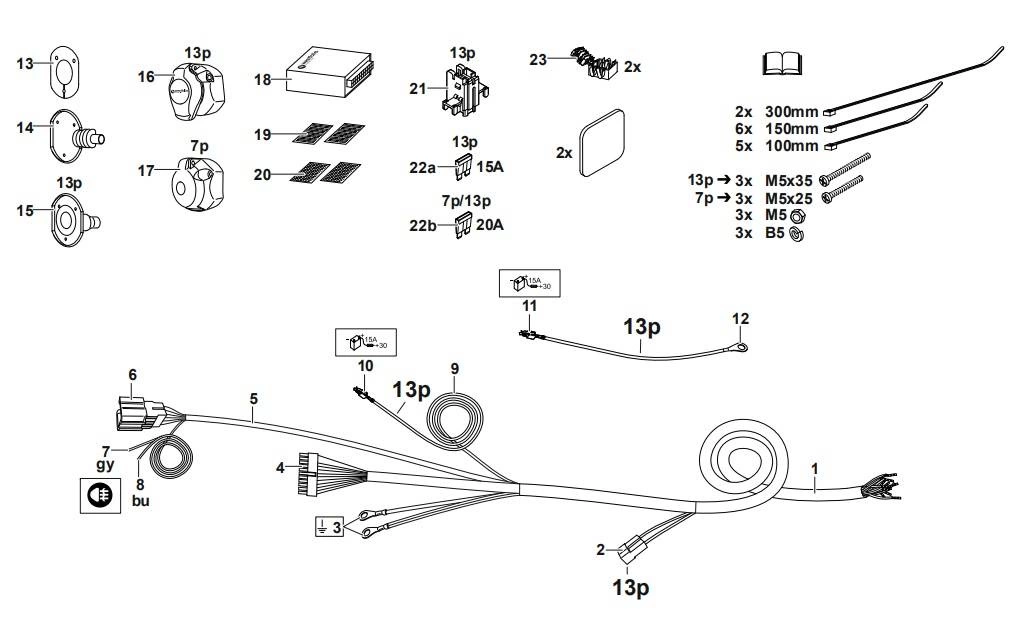 Wiązka posiada 13-pinowe gniazdo odpowiednie dla bagażnika rowerowego i przyczep ze światłem wstecznym.