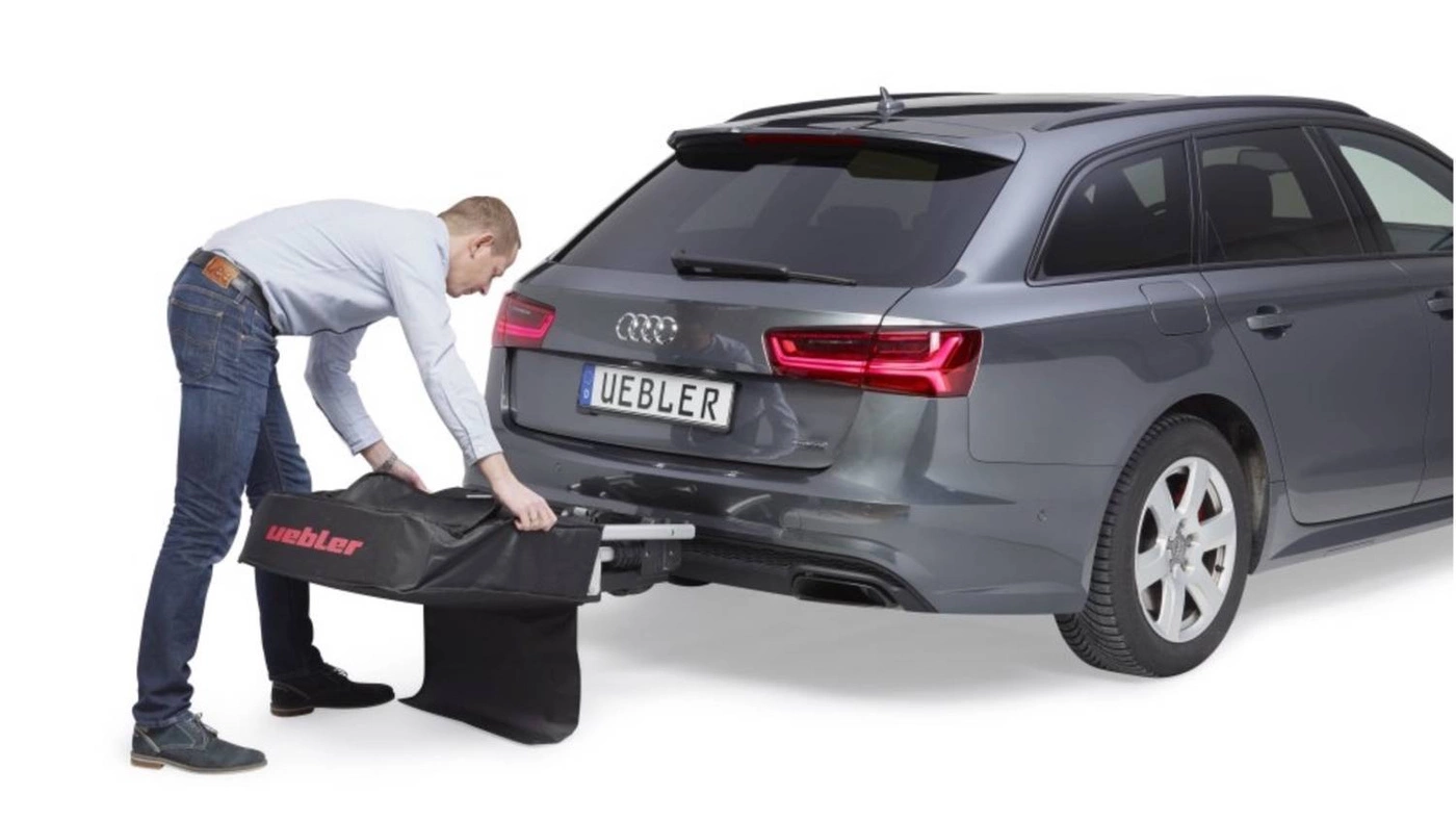 Pokrowiec do przechowywania platformy rowerowej ha hak marki Uebler. Wykonana z wytrzymałego materiału, posiada uchwyty ułatwiające przenoszenie bagażnika.