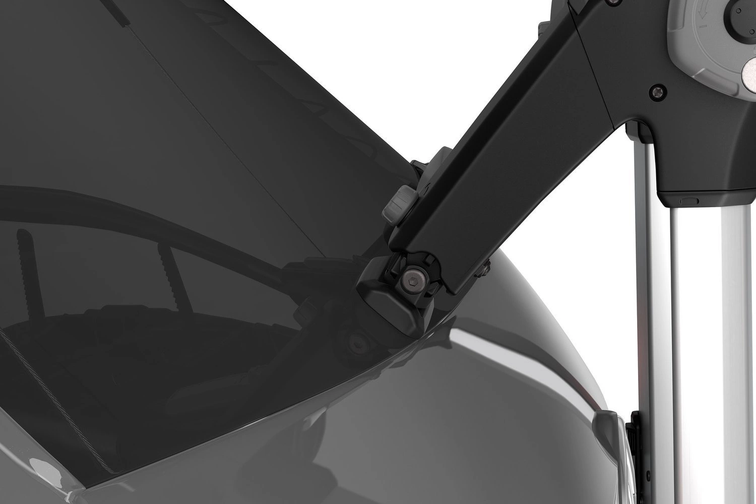 Łatwe mocowanie rowerów przy użyciu regulowanych/odłączanych ramion oraz dzięki gałkom Thule AcuTight, które kliknięciem sygnalizują osiągnięcie optymalnej siły dokręcenia