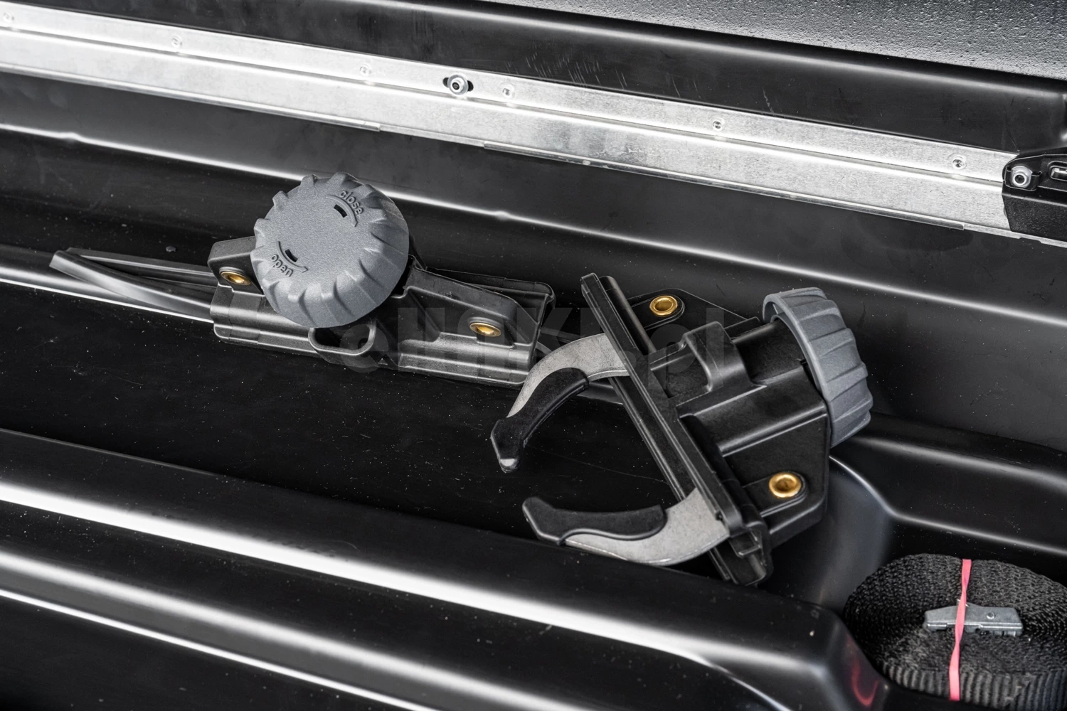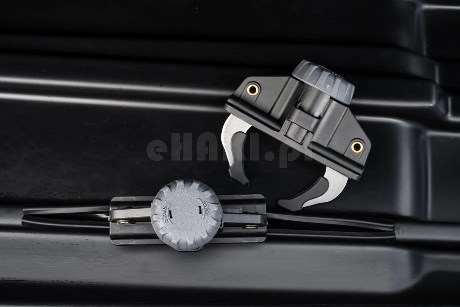 • Wysoka jakość wykonania – podnośniki i szczęki mocujące ułatwiają użytkowanie boxu, a jego konstrukcja chroni przed wodą, dzięki czemu bagaż jest bezpieczny nawet podczas deszczu.