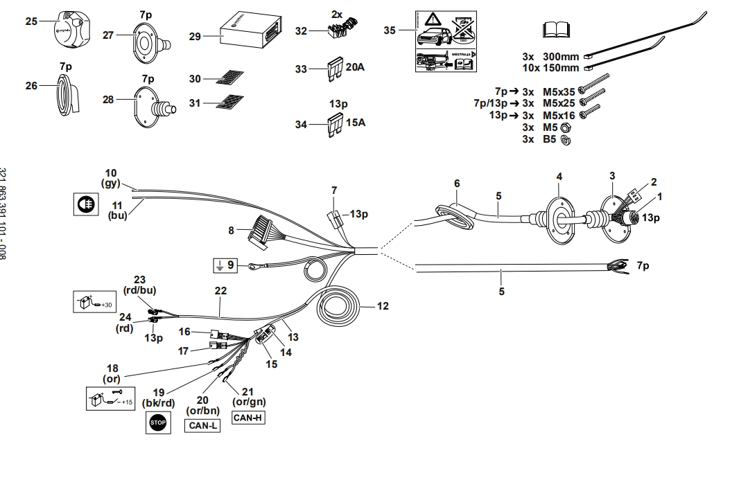 Wiązka ta oferuje łatwe i bezpieczne połączenie elektryczne do montażu akcesoriów takich jak hak holowniczy, zapewniając również funkcje takie jak akustyczna kontrola kierunkowskazów oraz możliwość odłączenia czujników parkowania (jeśli przycisk jest dostępny w desce rozdzielczej). Warto zaznaczyć, że wiązka nie wymaga kodowania po montażu, co znacznie upraszcza proces instalacji. Podłączenie zasilania odbywa się z przodu pojazdu.
