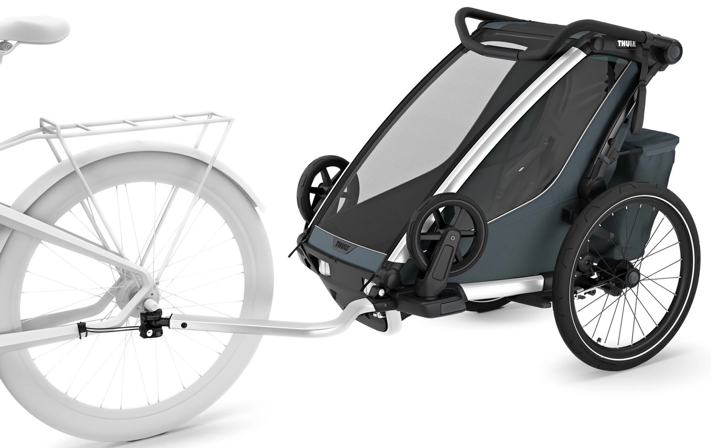 Thule Chariot Cross 2 oferuje niezwykłą wygodę i elastyczność. Można ją łatwo przekształcić z przyczepki rowerowej na wózek spacerowy poprzez szybkie obrócenie koła jedną ręką. Nowo zaprojektowane ramię zaczepu posiada system bezpiecznego mocowania zatrzaskowego, a wbudowany zamek dodatkowo zabezpiecza sprzęt. Możliwość instalacji jednego lub dwóch siedzisk sprawia, że Thule Chariot Cross 2 dostosowuje się do potrzeb każdej rodziny.