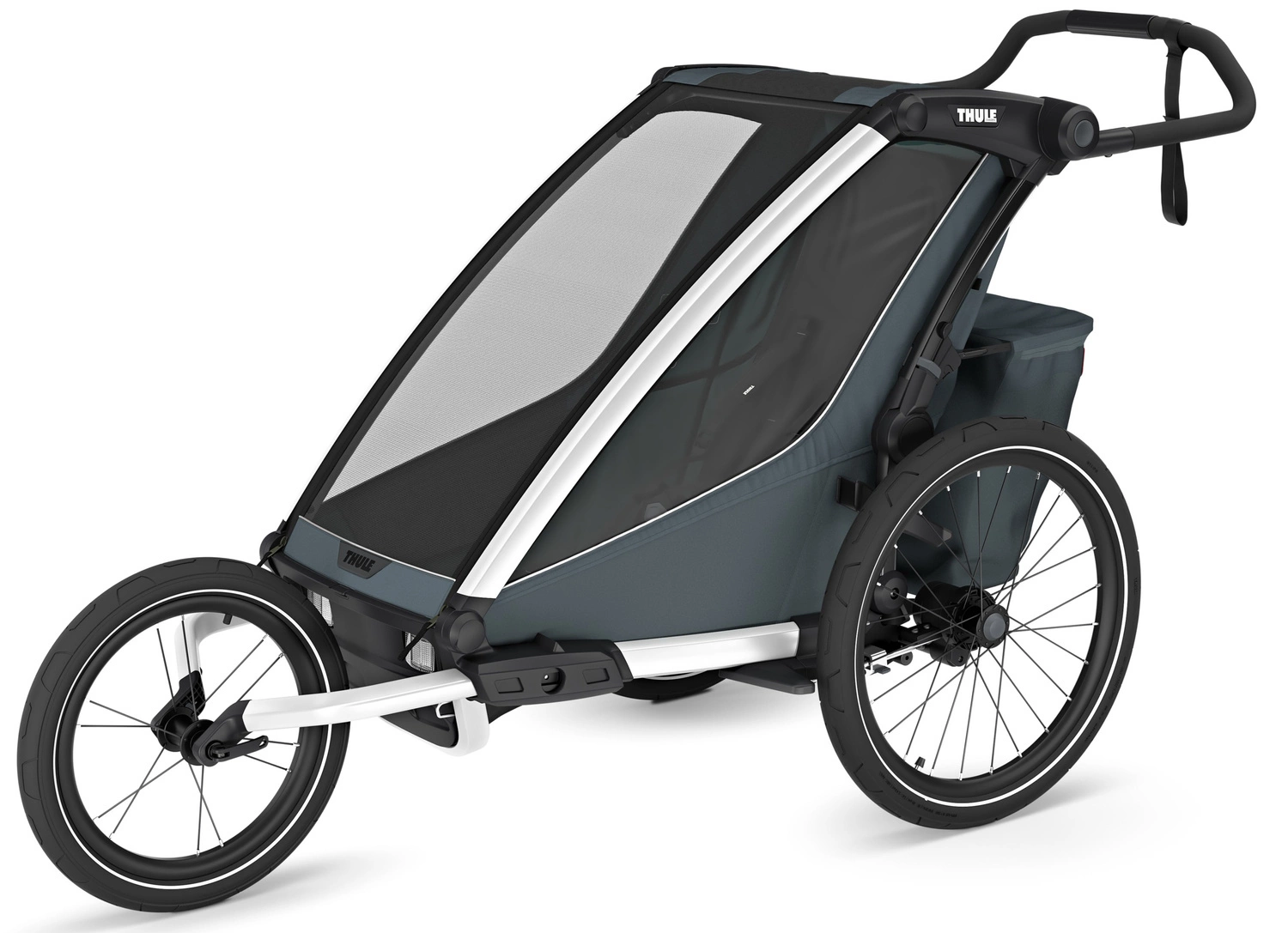 Praktyczne przechowywanie: Rozwiązanie Thule Click n’ Store dla wygodnego przechowywania zestawu do spacerowania, biegania i jazdy na rowerze.