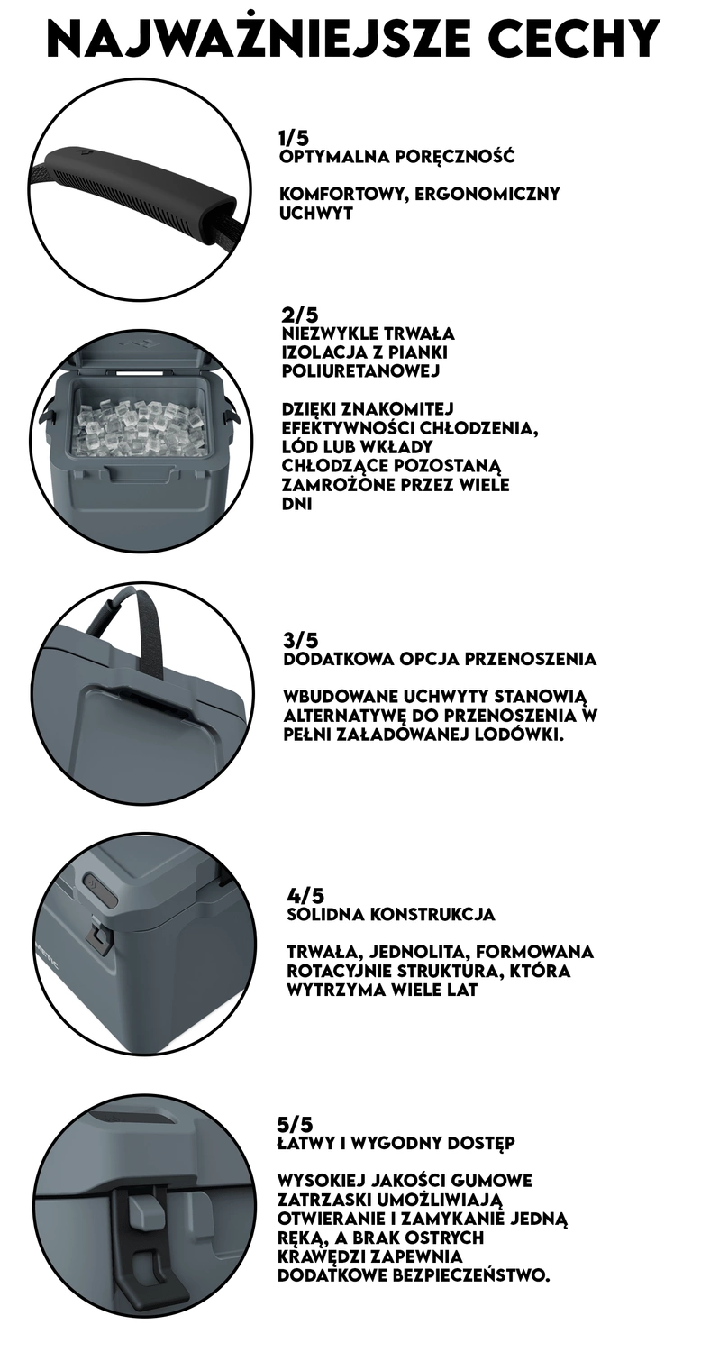 Konstrukcja rotomoulded oznacza, że nie ma szwów, przez które ciepło mogłoby się dostać do wnętrza lub zimno mogłoby uciec. Cool Ice Icechests są również wyjątkowo wytrzymałe, trwałe i łatwe do czyszczenia.