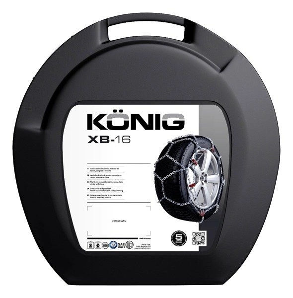 Po założeniu łańcuchów i krótkiej jeździe z małą prędkością, konieczne jest zatrzymanie się, aby prawidłowo dociągnąć łańcuchy. König XB-16 spełnia wszystkie wymagania prawne dotyczące wyposażenia zimowego, zgodnie z certyfikatami Ö-Norm V5117, Ö-Norm V5119, UNI 11313 oraz EN 16662-1.