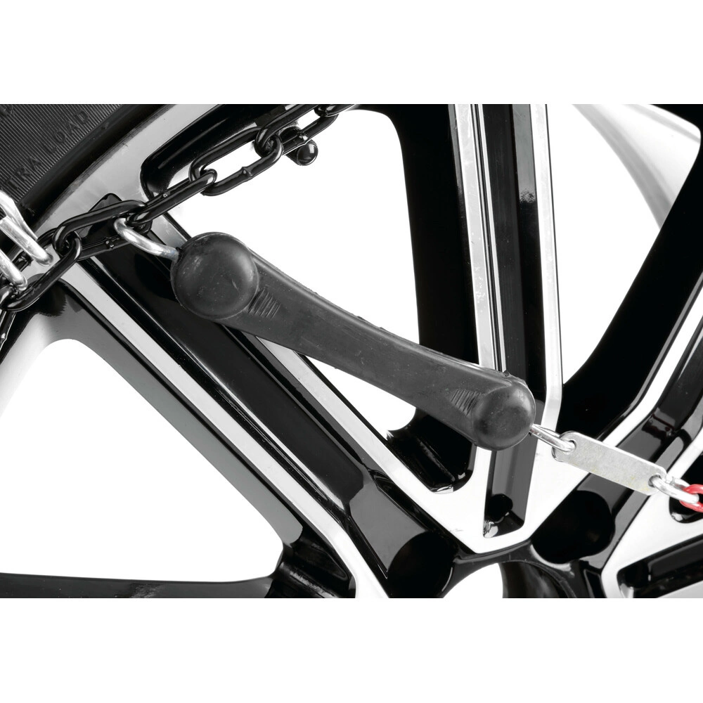System zewnętrznego mocowania z blokadą łańcucha umożliwia szybki montaż i demontaż. Krótkie ogniwa w kształcie litery „D” są użytkowane dwustronnie, co zwiększa ich żywotność. Elastyczna linka wewnętrzna ułatwia instalację, nawet w trudnych warunkach zimowych.