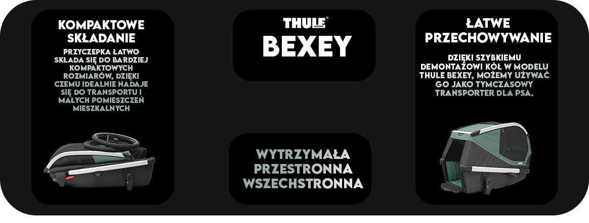 Thule Bexey M charakteryzuje się nowoczesnym i eleganckim wyglądem. Wykonana z materiałów odpornych na promieniowanie UV, jej kolorystyka ( Hazy Green ) zachowuje świeżość przez długi czas. Pomimo kompaktowych rozmiarów, przyczepka oferuje mnóstwo przestrzeni, aby Twój pies mógł się wygodnie ułożyć. Dodatkowo, jej konstrukcja jest aerodynamiczna, co zapewnia mniejsze opory powietrza podczas jazdy.