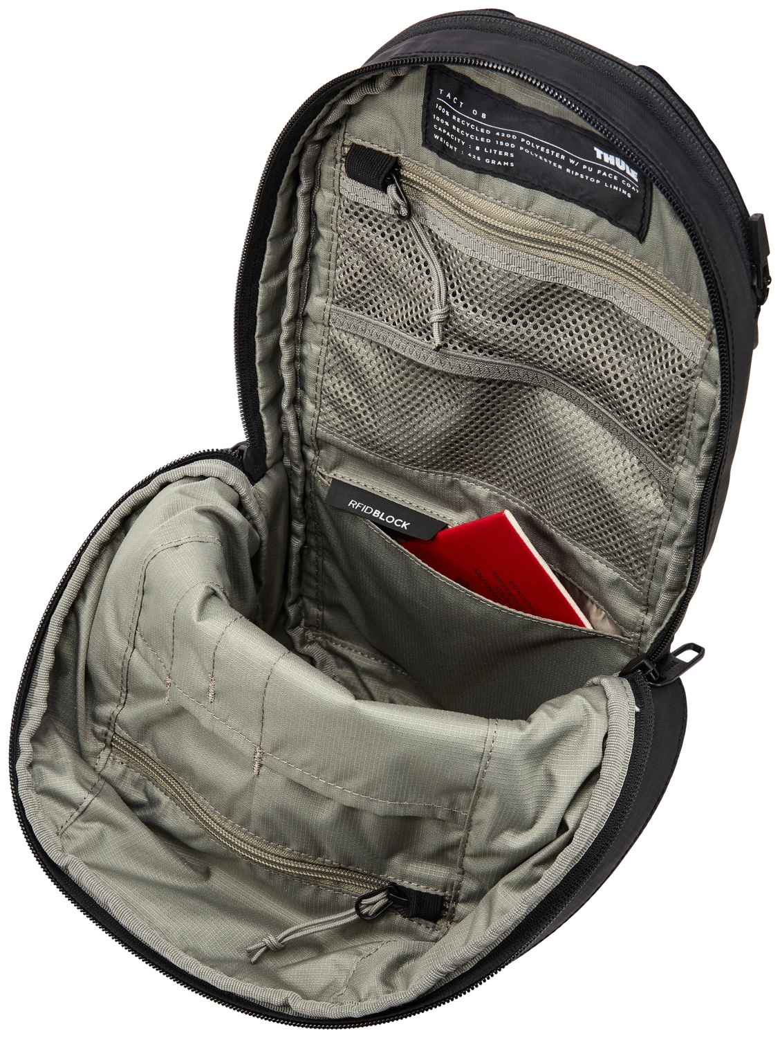 Główna komora wyposażona w ukryte zamki, tylny otwór i klapkę z zatrzaskiem, które zapewniają dodatkowe zabezpieczenie przed kradzieżą. Dodatkowo kieszeń blokująca fale radiowe chroni Twoje dane i tożsamość.