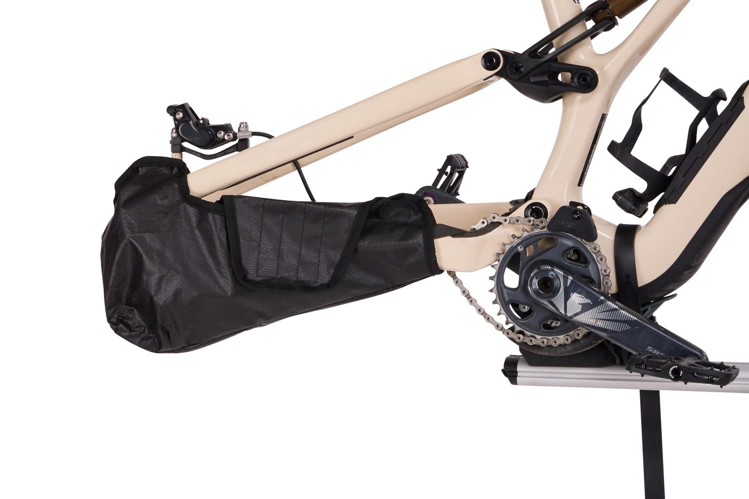 Dedykowane kieszenie na tarcze hamulcowe oraz osłona układu napędowego skutecznie zabezpieczają kluczowe elementy roweru.
